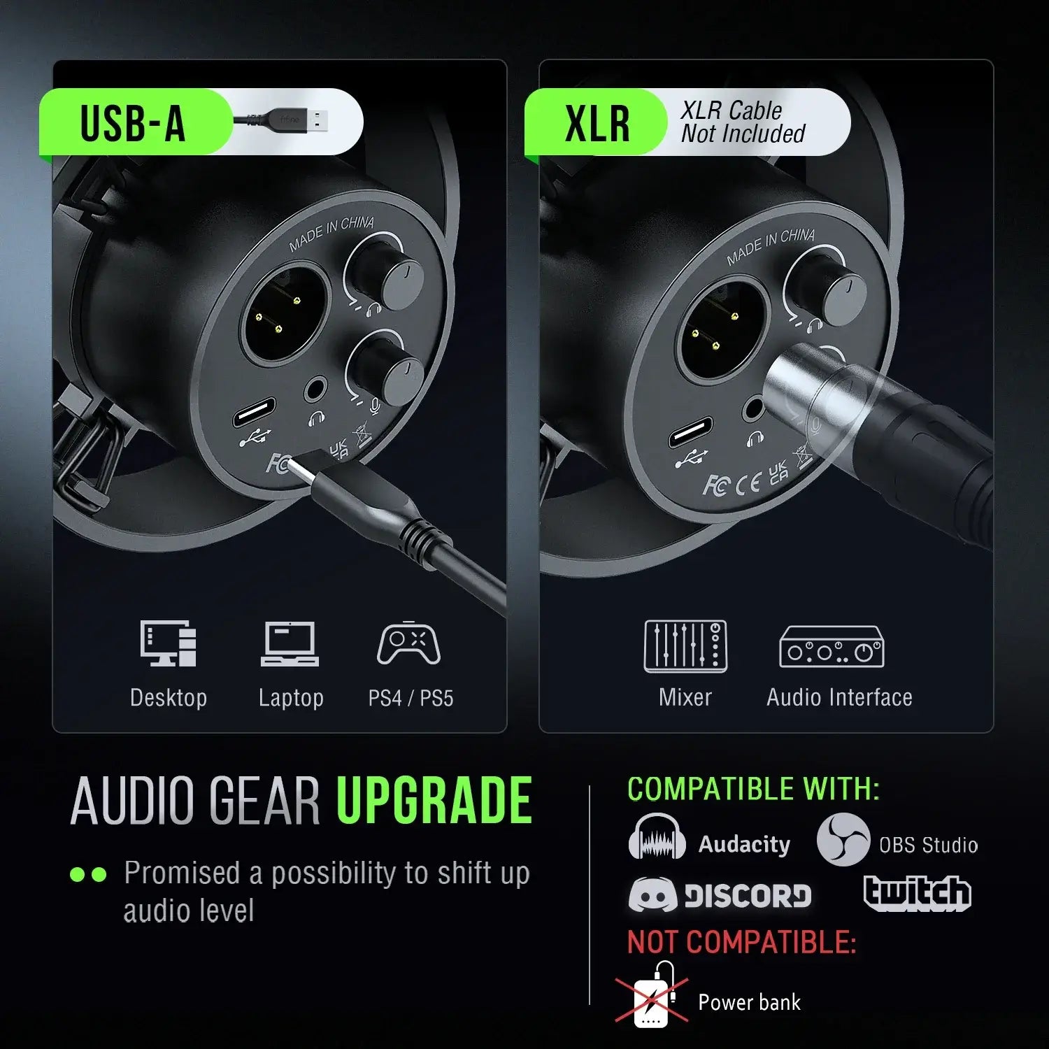 Double connectique USB/XLR : pour un usage plug & play ou une intégration dans une configuration studio.